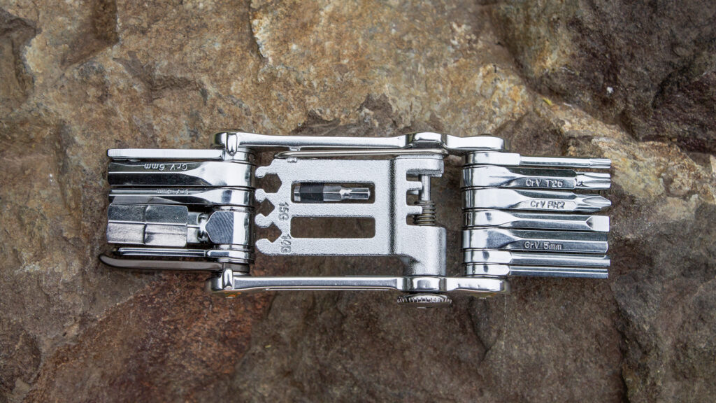A pesar de sus pequeñas dimensiones, esta multiherramienta cuenta con más de 20 funciones: llaves Allen, llaves Torx, destornilladores, llave para rayos, desmontador, corta cadenas, entre muchas otras.